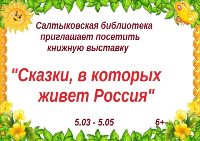 Опубликовано в АНОНСЫ КНИЖНАЯ ВЫСТАВКА «СКАЗКИ, В КОТОРЫХ ЖИВЕТ РОССИЯ» Опубликовано на 05.03.2026 С 05 марта по 05 мая Салтыковская СБФ Приглашает на книжную выставку.