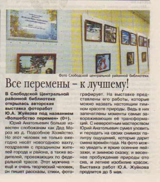 Все перемены – к лучшему! : [в Центральной районной библиотеке открылась авторская выставка фоторабот Ю. А. Жуйкова под названием «Волшебство перемен»] // Слободские куранты. – 2026. – 13 марта (№ 11). – С. 7.