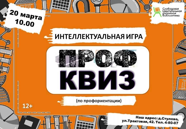 Опубликовано в АНОНСЫ ИНТЕЛЛЕКТУАЛЬНАЯ ИГРА «ПРОФКВИЗ» Опубликовано на 18.03.2026 20 марта в 10-00 Центральная районная библиотека Приглашает на интеллектуальную игру.