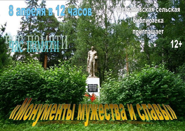 Опубликовано в АНОНСЫ ЧАС ПАМЯТИ «МОНУМЕНТЫ МУЖЕСТВА И СЛАВЫ» Опубликовано на 06.04.2026 08 апреля в 12-00 Шестаковская СБФ Приглашает на час памяти.