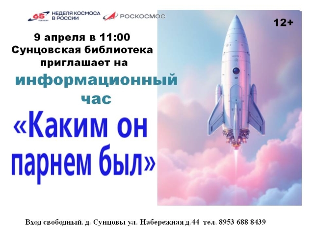 Опубликовано в АНОНСЫ ИНФОРМАЦИОННЫЙ ЧАС «КАКИМ ОН ПАРНЕМ БЫЛ» Опубликовано на 07.04.2026 09 апреля в 11-00 Сунцовская СБФ Приглашает на информационный час.