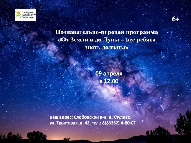 Опубликовано в ПРОЕКТЫ И ПРОГРАММЫ ПОЗНАВАТЕЛЬНО-ИГРОВАЯ ПРОГРАММА «ОТ ЗЕМЛИ И ДО ЛУНЫ — ВСЕ РЕБЯТА ЗНАТЬ ДОЛЖНЫ» Опубликовано на 08.04.2026 09 апреля в 12-00 Центральная районная библиотека Приглашает на познавательно-игровую программу.