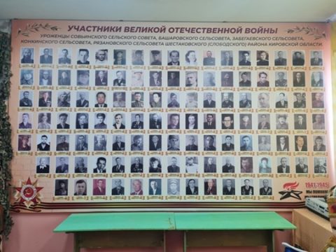 Центральную стену музея украсил баннер «Участники Великой Отечественной войны, уроженцы Совьинского сельского совета, Башаровского сельсовета, Забегаевского сельсовета, Конкинского сельсовета, Рязановского…