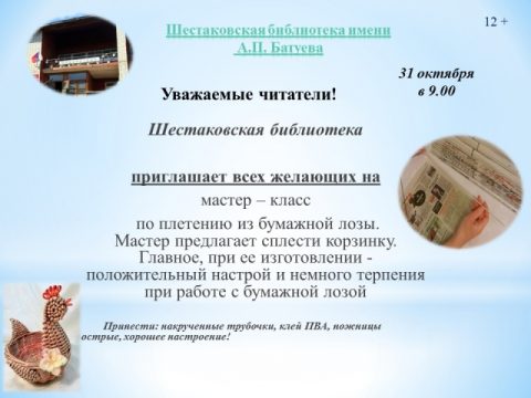 31 октября в 09-00 Шестаковская библиотека имени А.П. Батуева Приглашает на мастер-класс.
