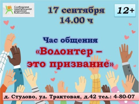 17 сентября в 14-00 Слободская Центральная районная библиотека Приглашает на час общения.