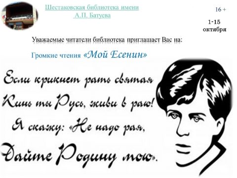 С 01 по 15 октября Шестаковская библиотека имени А.П. Батуева Приглашает принять участие в громких чтениях.